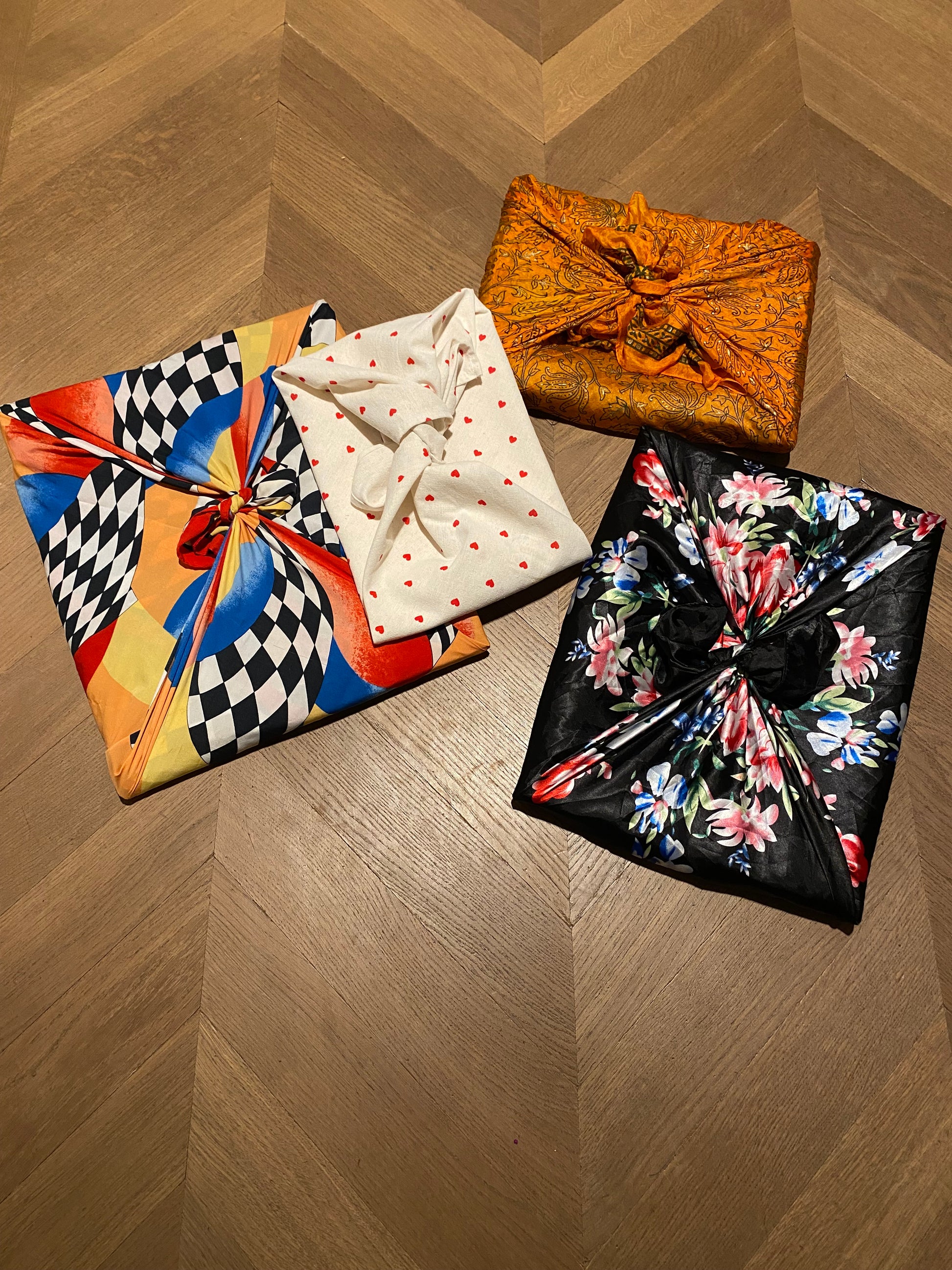 De visjes pak ik in een sjaal of doek in, want dat ziet er mooi uit en scheelt pakpapier. De foto is een voorbeeld, prints verschillen. Ook doe ik er een plakhaakje bij om eventueel mee op te hangen.
