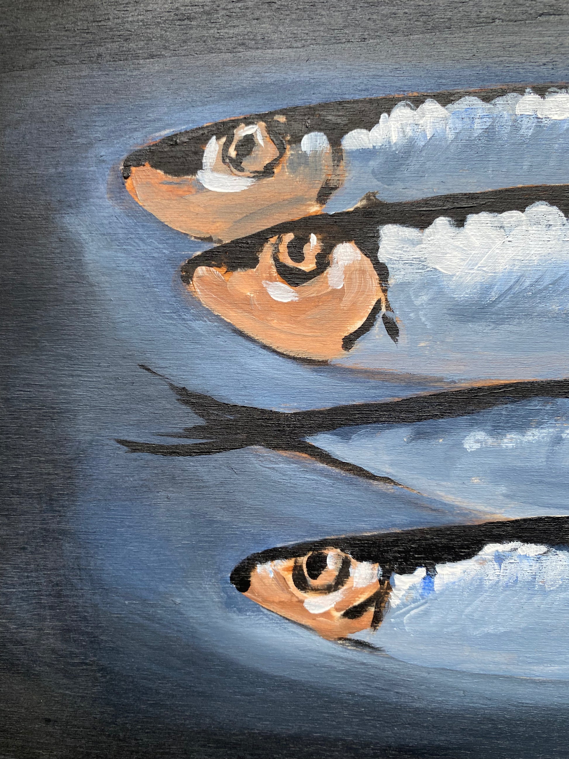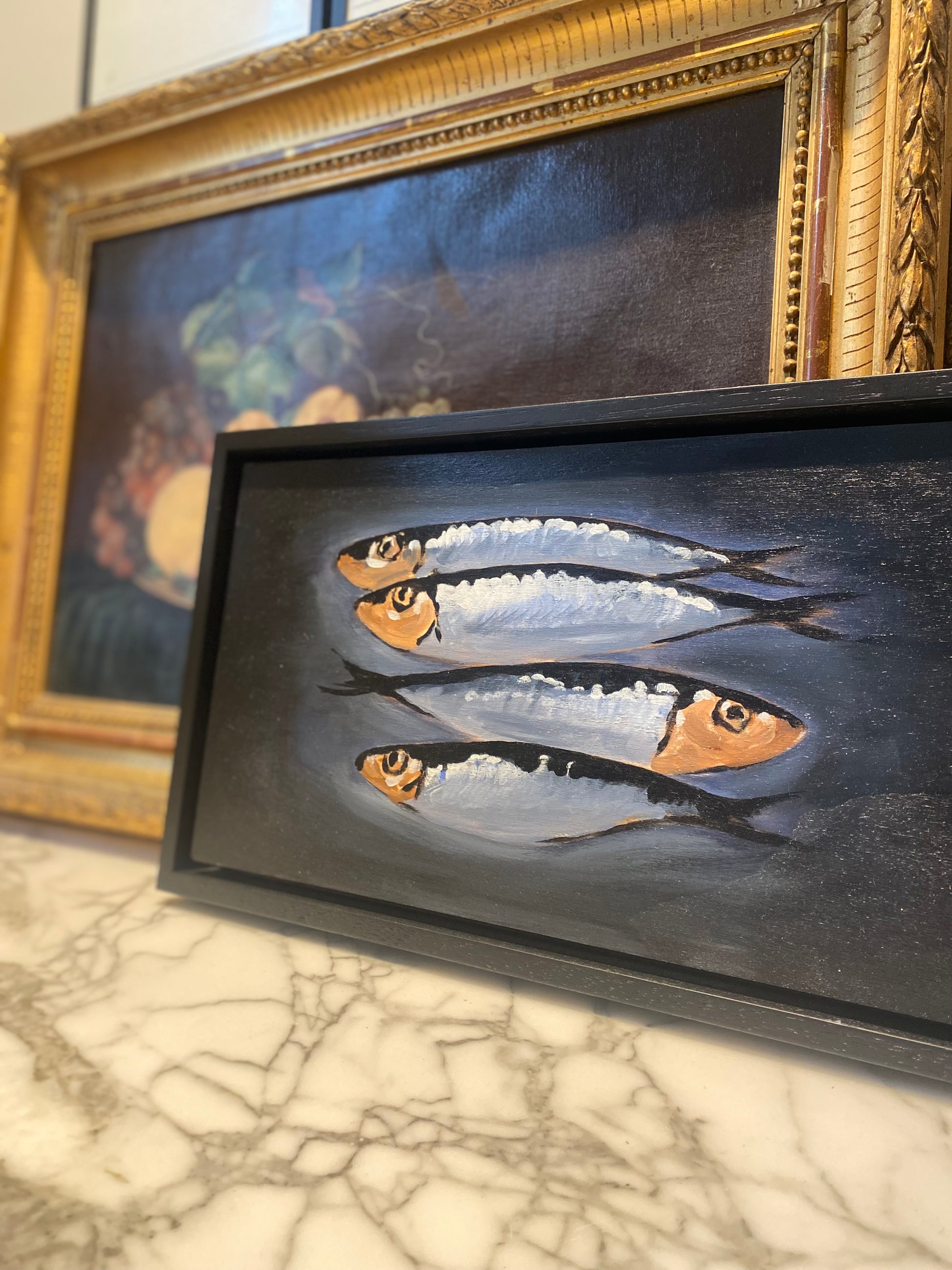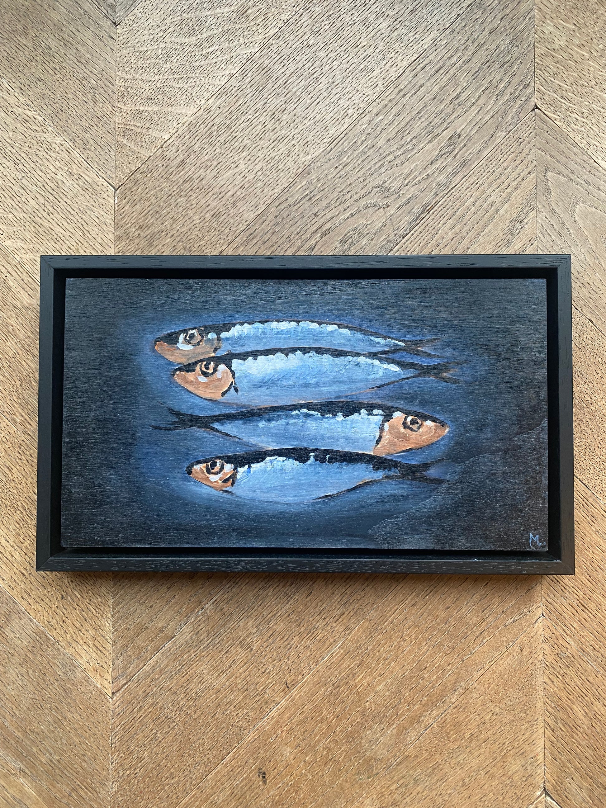 De visjes pak ik in een sjaal of doek in, want dat ziet er mooi uit en scheelt pakpapier. De foto is een voorbeeld, prints verschillen. Ook doe ik er een plakhaakje bij om eventueel mee op te hangen.